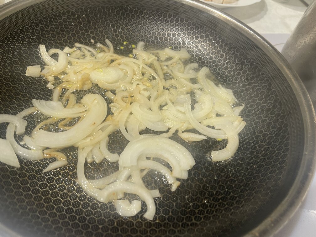 - In the same pan, add the sliced onions and cook until soft and slightly golden.