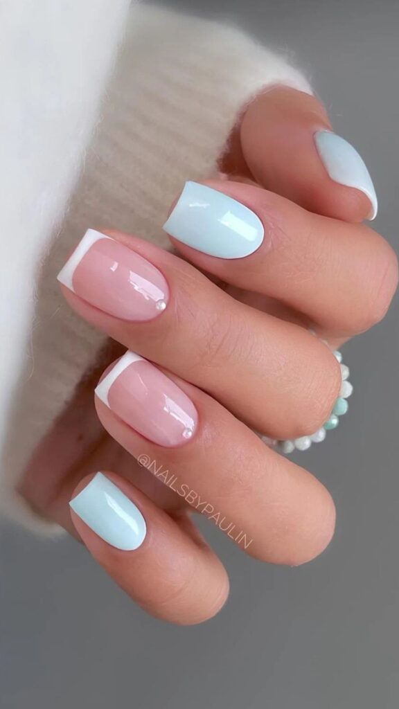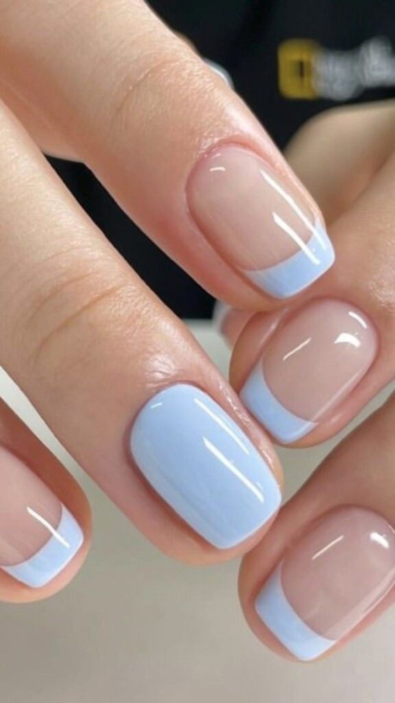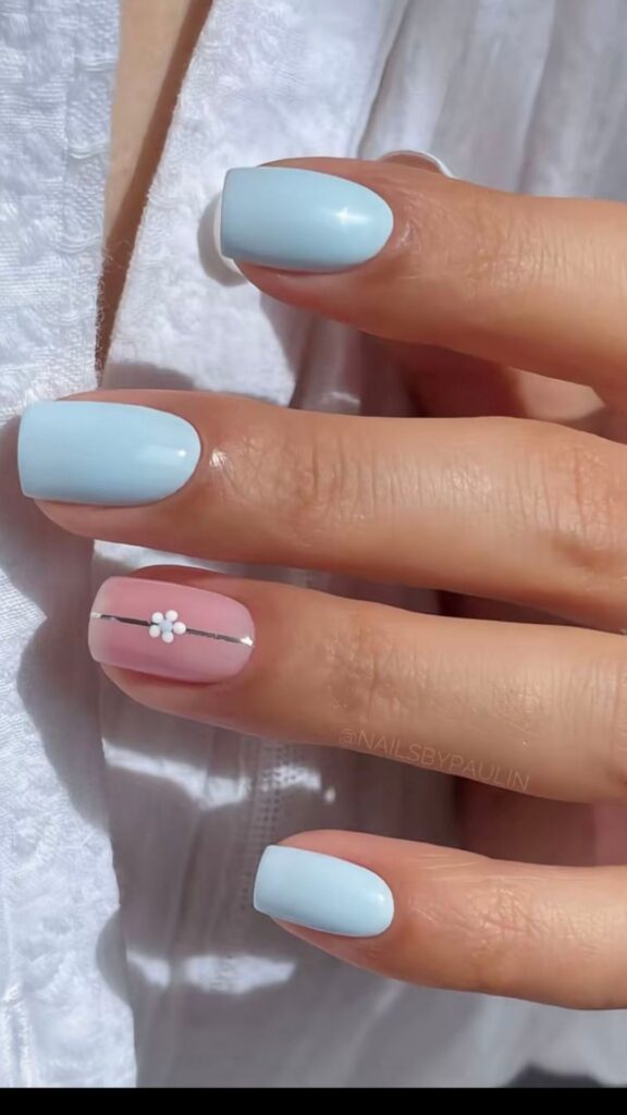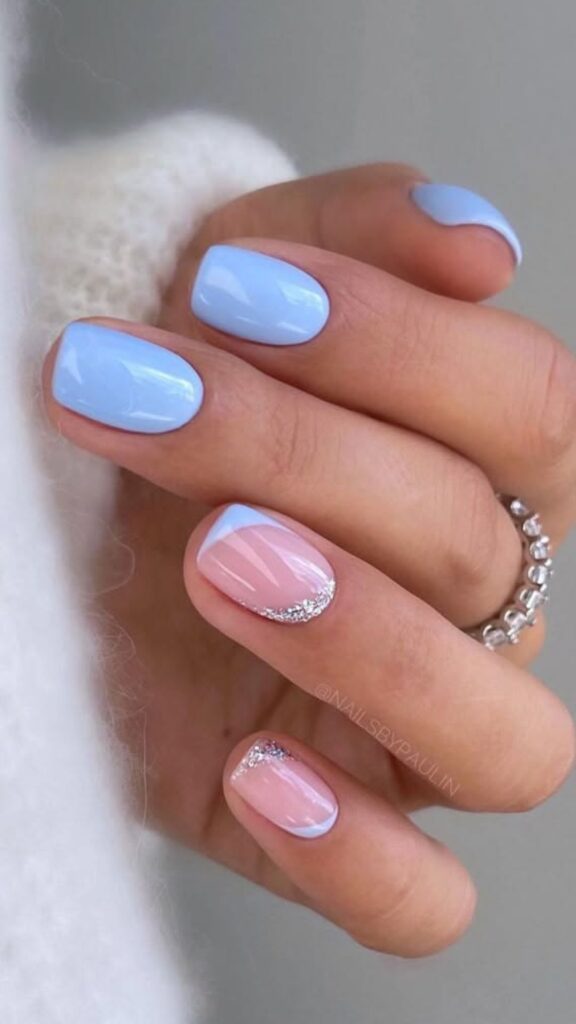 Glossy pastel blue nails paired with a soft pink accent nail featuring a subtle shimmer.
