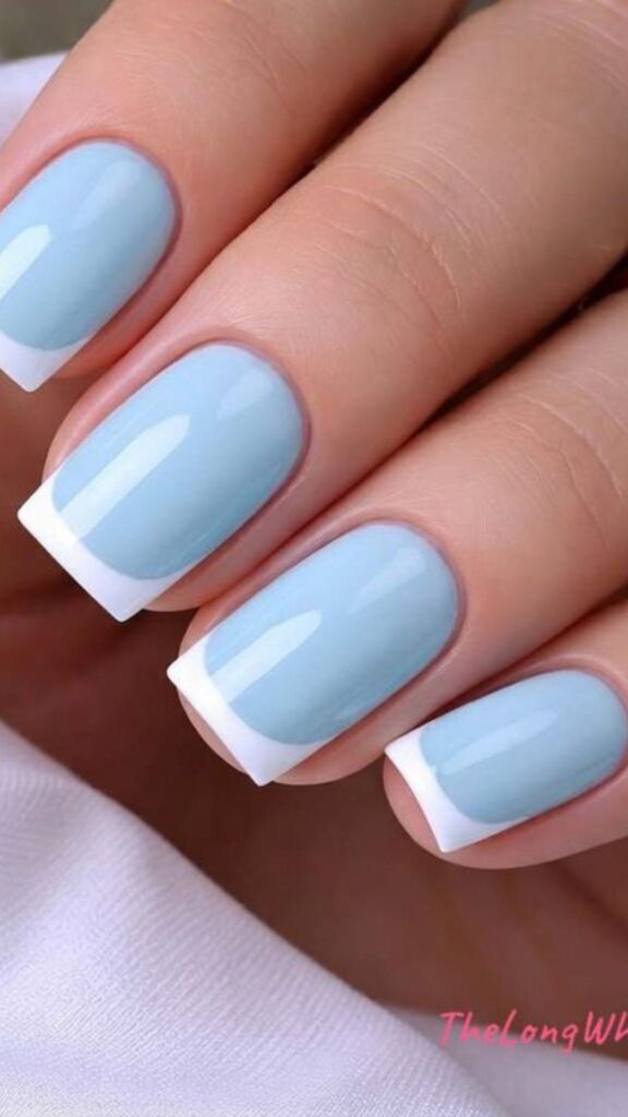 Classic square manicure with modern pastel blue base and crisp white French tips.