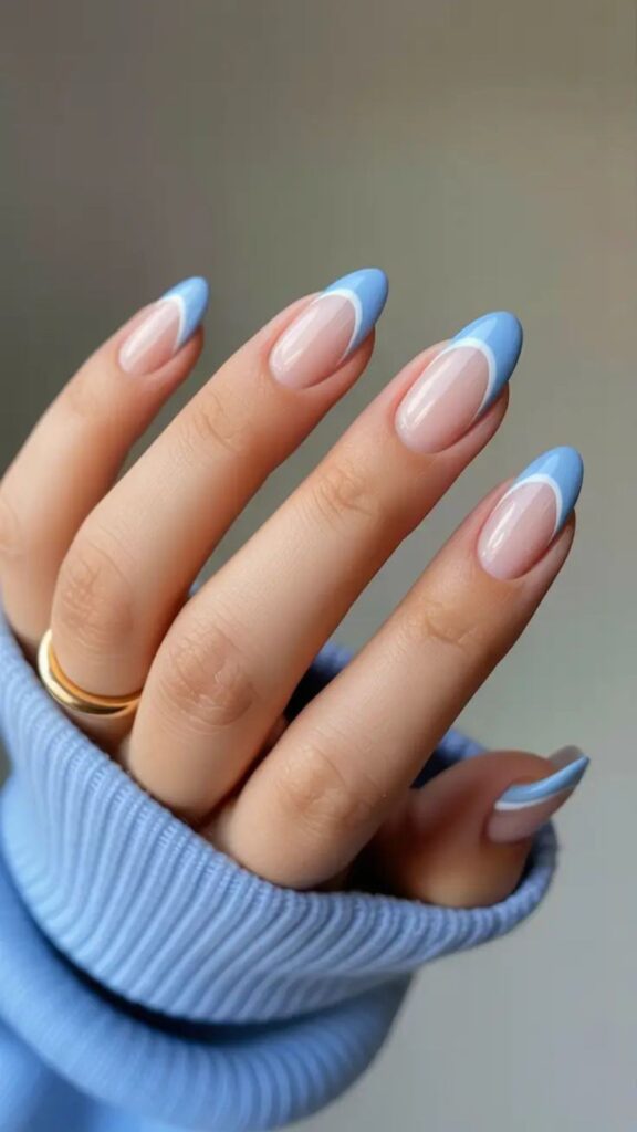 Elegant almond-shaped nails with a smooth pastel blue ombre fade for a dreamy, airy look.