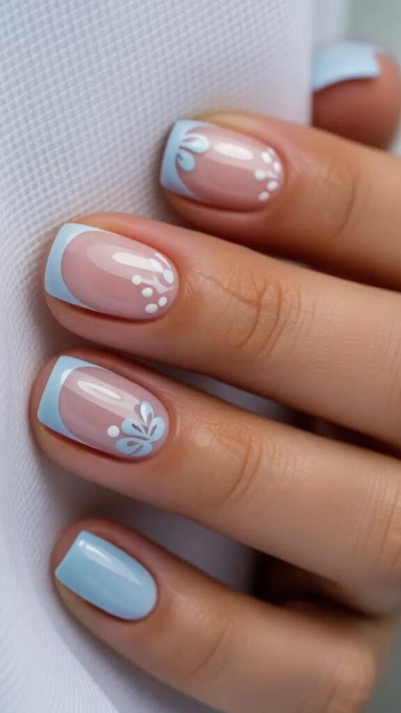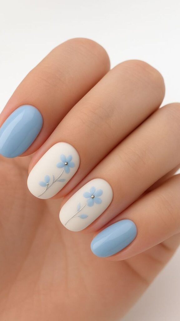 Pastel blue nails with tiny white floral details and soft feminine charm.