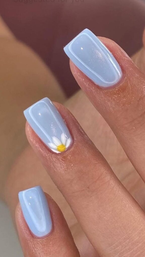 Light blue nails decorated with delicate white daisy flower designs for a spring vibe.