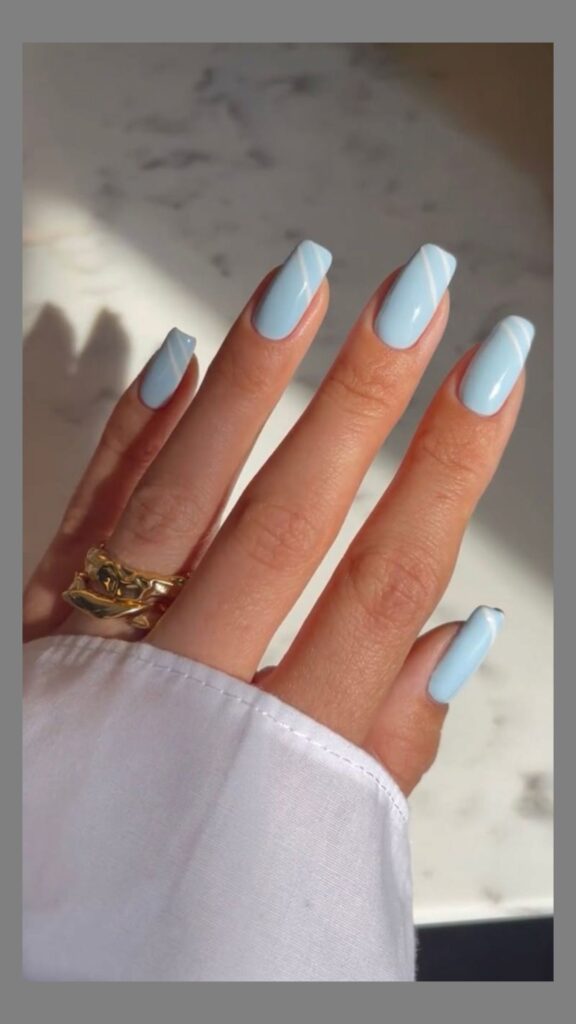 Minimal pastel blue nails styled with gold rings for a luxury aesthetic feel.